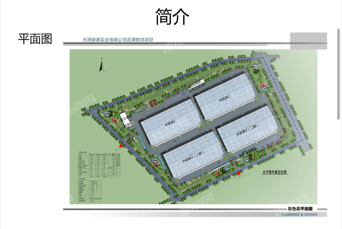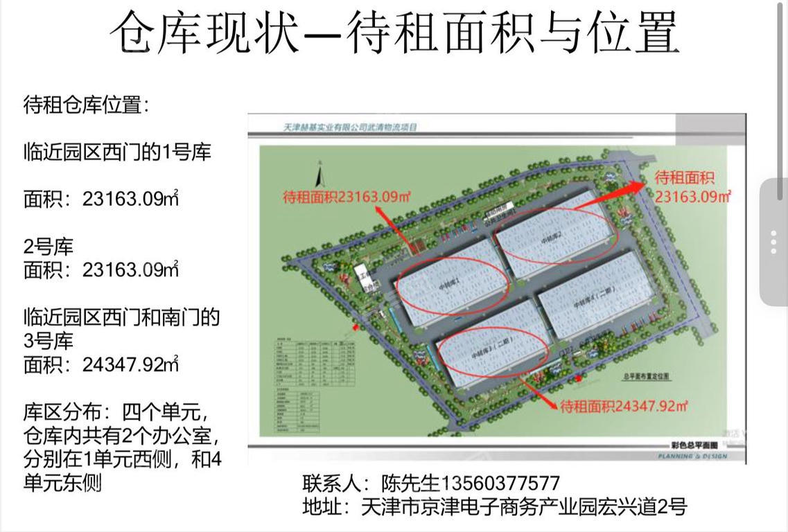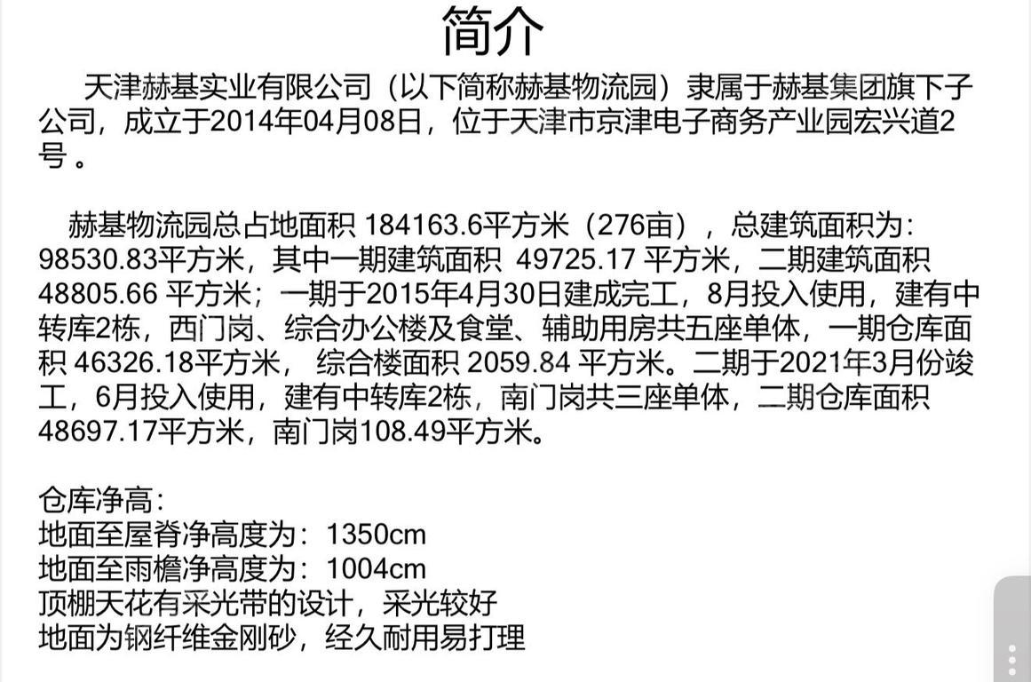 简介 天津赫基实业有限公司(以下简称赫基物流园)隶属于赫基集团旗下子 公司,成立于2014年04月08日,位于天津市京津电子商务产业园宏兴道2 号。 赫基物流园总占地面积184163.6平方米(276亩),总建筑面积为: 98530.83平方米,其中一期建筑面积49725.17平方米,二期建筑面积 48805.66平方米;一期于2015年4月30日建成完工,8月投入使用,建有中 转库2栋,西门岗、综合办公楼及食堂、辅助用房共五座单体,一期仓车面 积46326.18平方米,综合楼面积2059.84平方米。二期于2021年3月分竣 工,6月投入使用,建有中转库2栋,南门岗共三座单体,二期仓库面积 48697.17平方米,南门岗108.49平方米。 仓库净高: 地面至屋脊净高度为:1350cm 地面至雨檐净高度为:1004cm 顶棚天花有采光带的设计,采光较好 地面为钢纤维金刚砂,经久耐用易打理