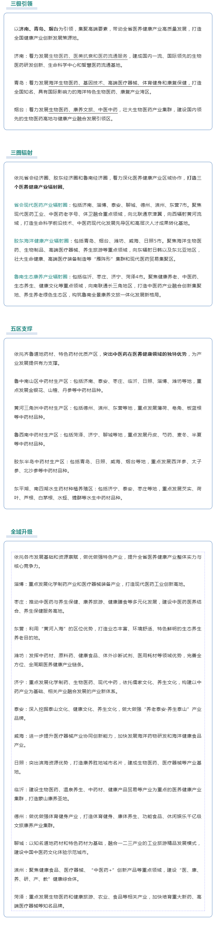 《发展规划》还提出,提升国际化医疗服务能力,支持鼓励济南、青岛、烟台等地引进国际化高端医疗集团,建设一批国际医学中心、重点专科国际合作基地,打造国际高端医疗服务中心,力争全省建设5家以上合资合作医疗机构。支持建设济南生物医药、青岛海洋生物医药、淄博综合医药、烟台生物医药与健康、济宁生物医药、临沂综合医药、菏泽现代医药港等生物医药产业集群,打造千亿级现代医药产业集群。发挥济南、青岛、临沂、聊城、菏泽等地中医药特色优势,建设一批百亿级中医药产业园区。