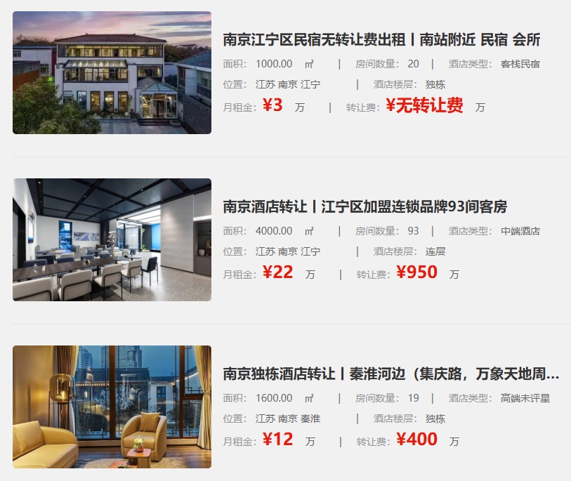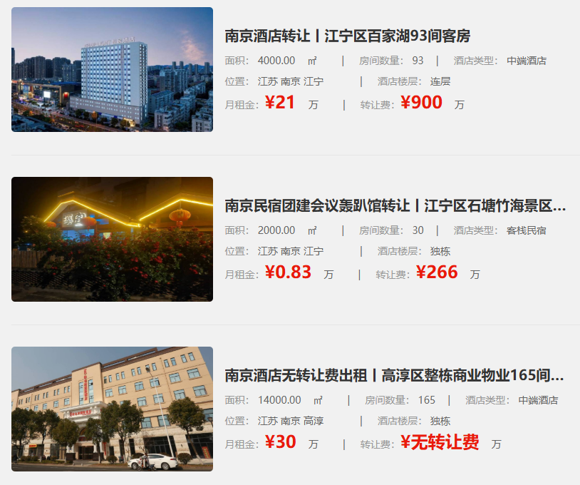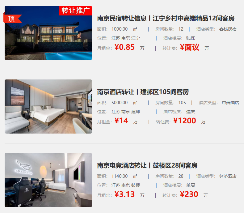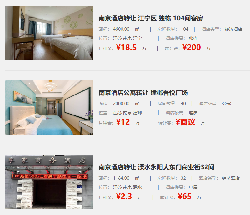 玄武区有88间客房、3200㎡的经济酒店无转让费出租,月租金9.2万。栖霞区有独栋的80间房经济酒店转让,2200㎡,月租金10.8万,转让费160万。这么多不同选择,你还不行动起来吗?南京酒店转让市场如此热闹,众多选择摆在眼前,赶紧抓住机会,说不定下一个酒店老板就是你!